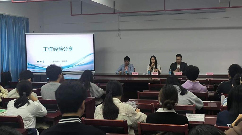 会上,郭泽鑫校友首先分享了自己作为优秀毕业生的工作经验以及职业生涯规划,并从自身经历进行分享实习、就业,介绍医药销售工作场景和技能要求。随后,金赛药业公司江门地区经理徐坤介绍了金赛药业公司,并进行了校招岗位的推介,让在场的学生对金赛药业公司有初步的了解。我院学子进一步明确了就业形式,树立了正确的择业观,提高了就业竞争力,通过就业“传帮带”的形式为我院学子高质量就业打下了坚实的基础。