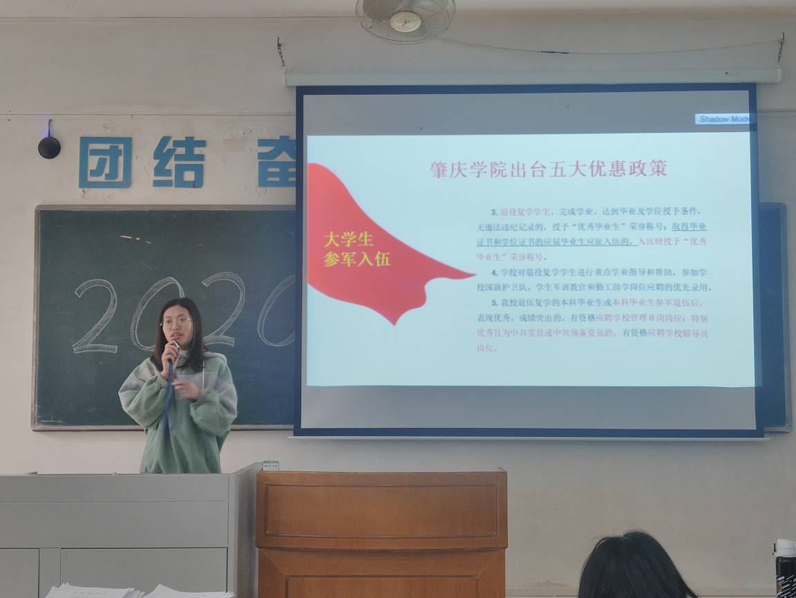 班会上,各班团支书、班长给同学们详细地介绍了大学生入伍的各项相关事宜,包括入伍报名的时间、具体条件、入伍流程、毕业生入伍服义务兵的鼓励政策、退伍后享有的优惠政策、士官直招的相关优惠政策和待遇等内容。最后,辅导员郑锐丽老师详细介绍了学校针对应届毕业生入伍的优惠政策,强调大学生应征入伍的意义,并耐心地解答同学们的疑惑,号召同学们参军入伍,为国防贡献力量。