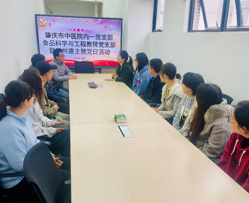 在新时代党的建设总要求下,探索联学共建的新模式,12月25日,食品科学与工程系教师党支部邀请肇庆市中医院内一党支部来学院开展中医主题讲座与座谈调研活动。肇庆市中医院医教部谢君副主任,肇庆市中医院内一党支部书记、脾胃科谢新坤主任参加了活动。