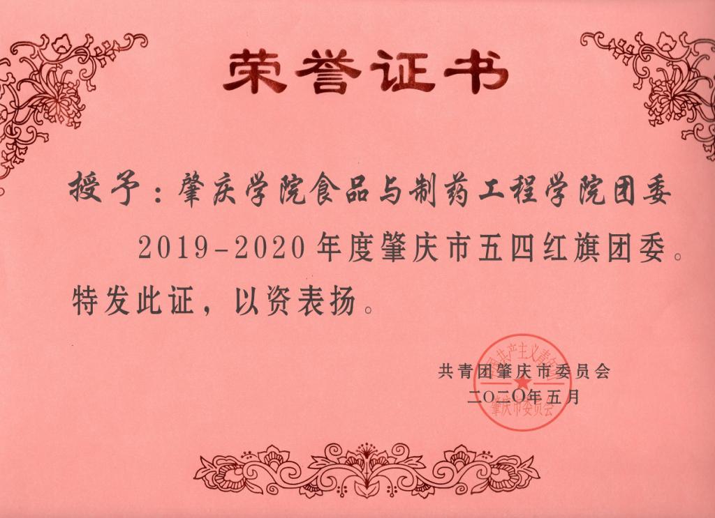 近日,由共青团肇庆市委员会组织开展的“肇庆市2019-2020年度共青团工作优秀个人和先进集体”评选活动结果揭晓,在学校团委和学院党委的领导和支持下,我院团委在全市各行各业团组织的激烈竞选中脱颖而出,获得“2019-2020年度肇庆市五四红旗团委”荣誉称号,成为端州区获此荣誉的两所单位之一,也是我校唯一获此殊荣的单位。