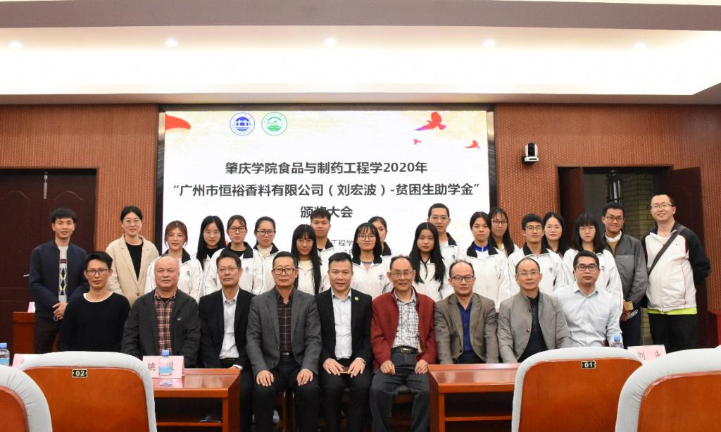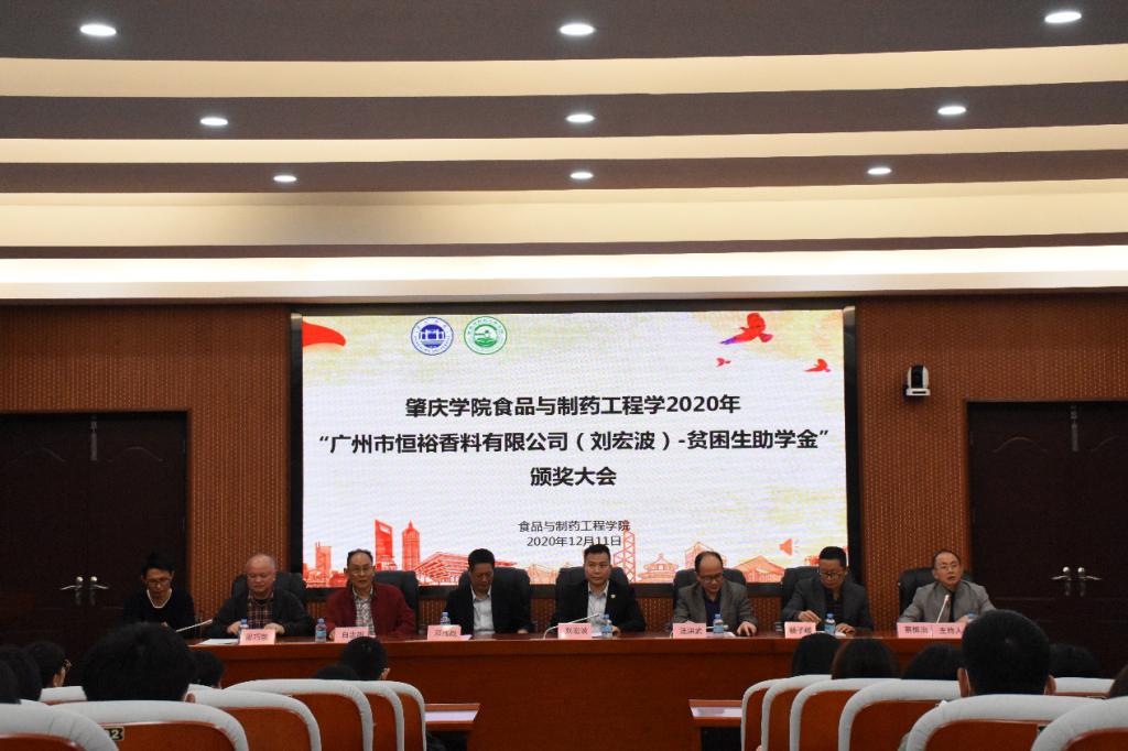 为进一步推进学风建设工作,表彰奖励勤奋学习、积极向上的困难学生,激发全院学生积极向上、奋发进取的精神,根据学院与广州市恒裕香料有限公司校企合作奖学金颁发相关要求,12月11日下午,我院在行政楼第二会议室举行了ok138cn太阳集团5292020年“广州市恒裕香料有限公司(刘宏波)-贫困生助学金”颁奖大会。参与本次颁奖大会的有太阳成教育发展基金会秘书长白志明、广州市恒裕香料有限公司董事刘宏波、邓伟战、原化学与化工学院副院长梁巧荣、我院院长汪洪武、党委书记杨子岐、副院长马德运、食品科学与工程系主任刘永、食品质量与安全系主任姚夙、实验室主任刘钊、办公室主任胡韧、辅导员伍思良、林小珊以及学生代表共120多人。颁奖大会由我院党委副书记蔡振治主持。
