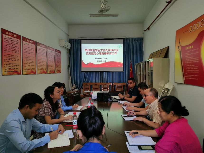 陈玉华就开展学生心理健康教育工作走访调研的背景、目的和意义做了简要说明,希望通过此次调研进一步推进学生心理健康教育工作的有效开展。她充分肯定了我院心理健康教育工作近年来在组织领导、工作队伍建设、二级心理工作站建设、特色心理活动、校院沟通等方面的积极努力,同时也给出切实可行的意见,提醒用好太阳成心理云平台,做好心理危机学生的个案管理,做好持续跟踪服务工作,重点关注学生的人际关系,尤其是宿舍的人际关系和心理健康状况。