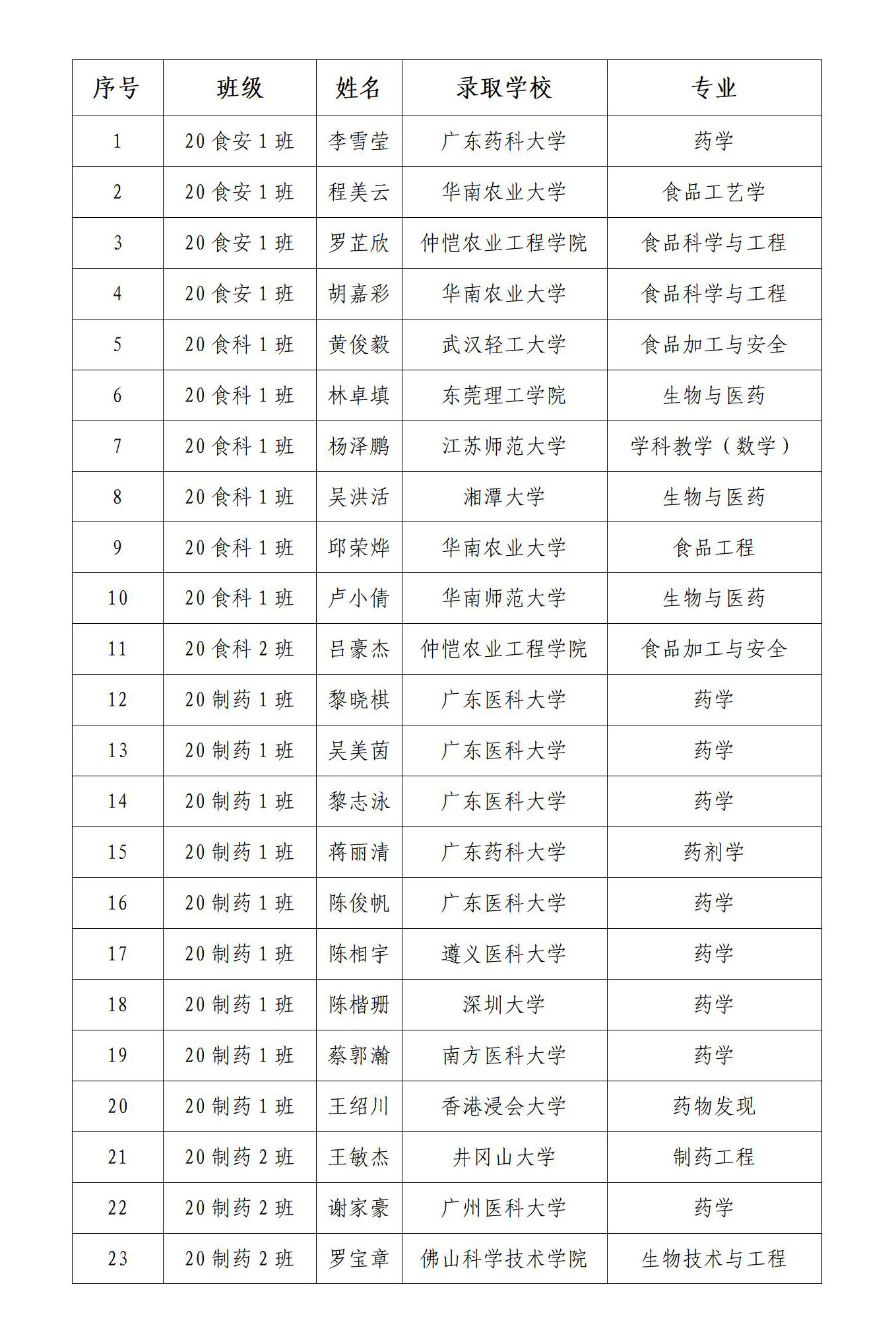 随着2024年全国硕士研究生招生录取工作落幕,我院应届毕业生考研再创佳绩。据统计,我院2024届203名毕业生中有61名同学报考研究生,录取23人,其中三分之一以上被华南师范大学、深圳大学、南方医科大学、华南农业大学、广东医科大学、广东药科大学等知名高校录取。考研成绩的取得不仅是我院莘莘学子不懈努力、辛勤付出的结果,同时也是我院全面落实立德树人根本任务、全面提升人才培养质量的具体体现。